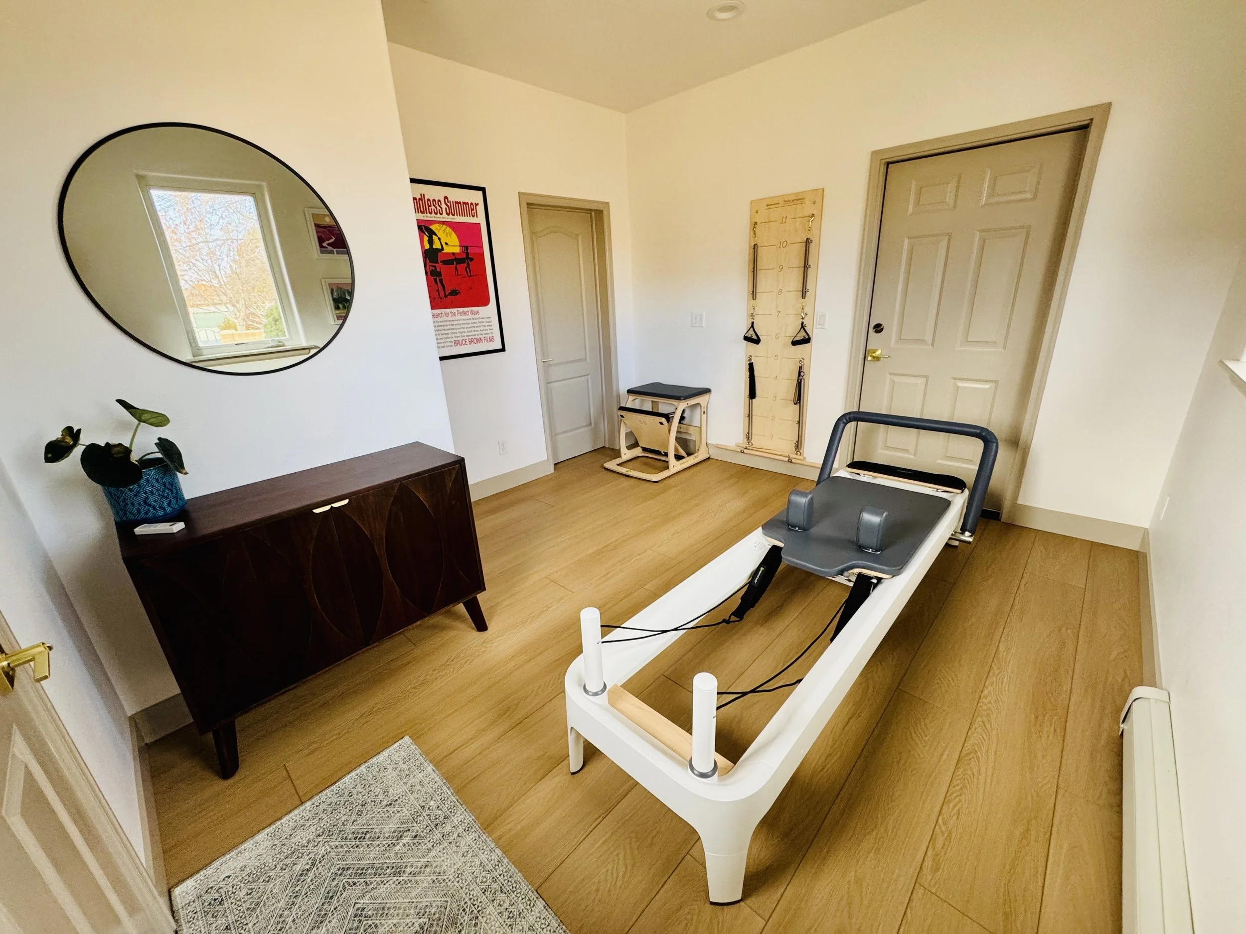The Pigeon Pilates studio has three pieces of Pilates equipment: the reformer, the chair, and the springboard. Each apparatus has unique benefits that will be used to challenge, strengthen, and rehabilitate based on individual goals and needs.